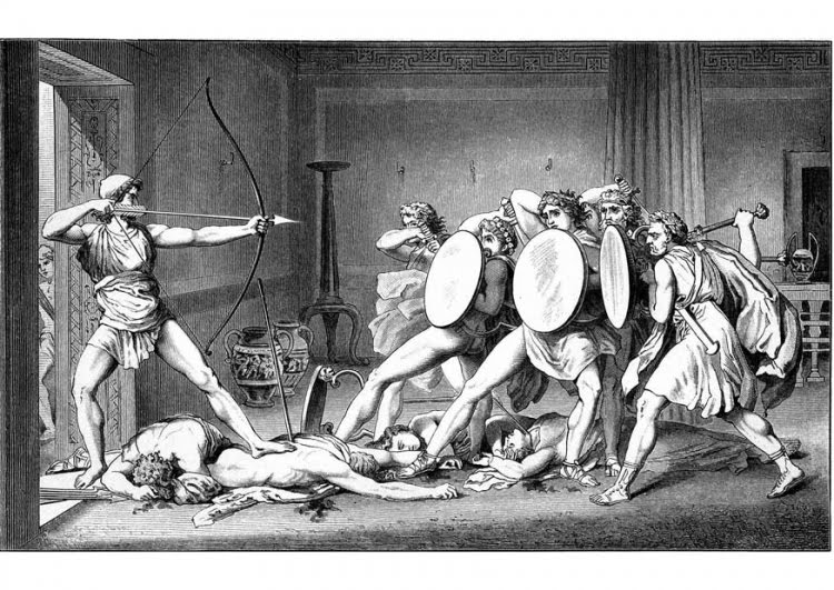 La cautividad sexual a la que lo somete Calipso, su arrogante e incauto enfrentamiento con el Cíclope, el masoquismo con que se deja seducir por los cantos de las sirenas antropófagas, atado al mástil, el delicadísimo trance de su nao entre Escila y Caribdis y el resto de sus hazañas marinas son–pese a la perpetuidad incónica de que han gozado en nuestra cultura–poca cosa frente al cruento retorno del rey de Ítaca.